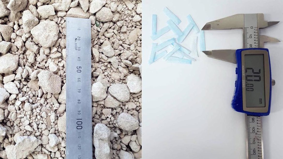 El nuevo material combina agregado de hormigón reciclado (Izquierda) y pequeñas tiras de mascarillas desechables trituradas (derecha).